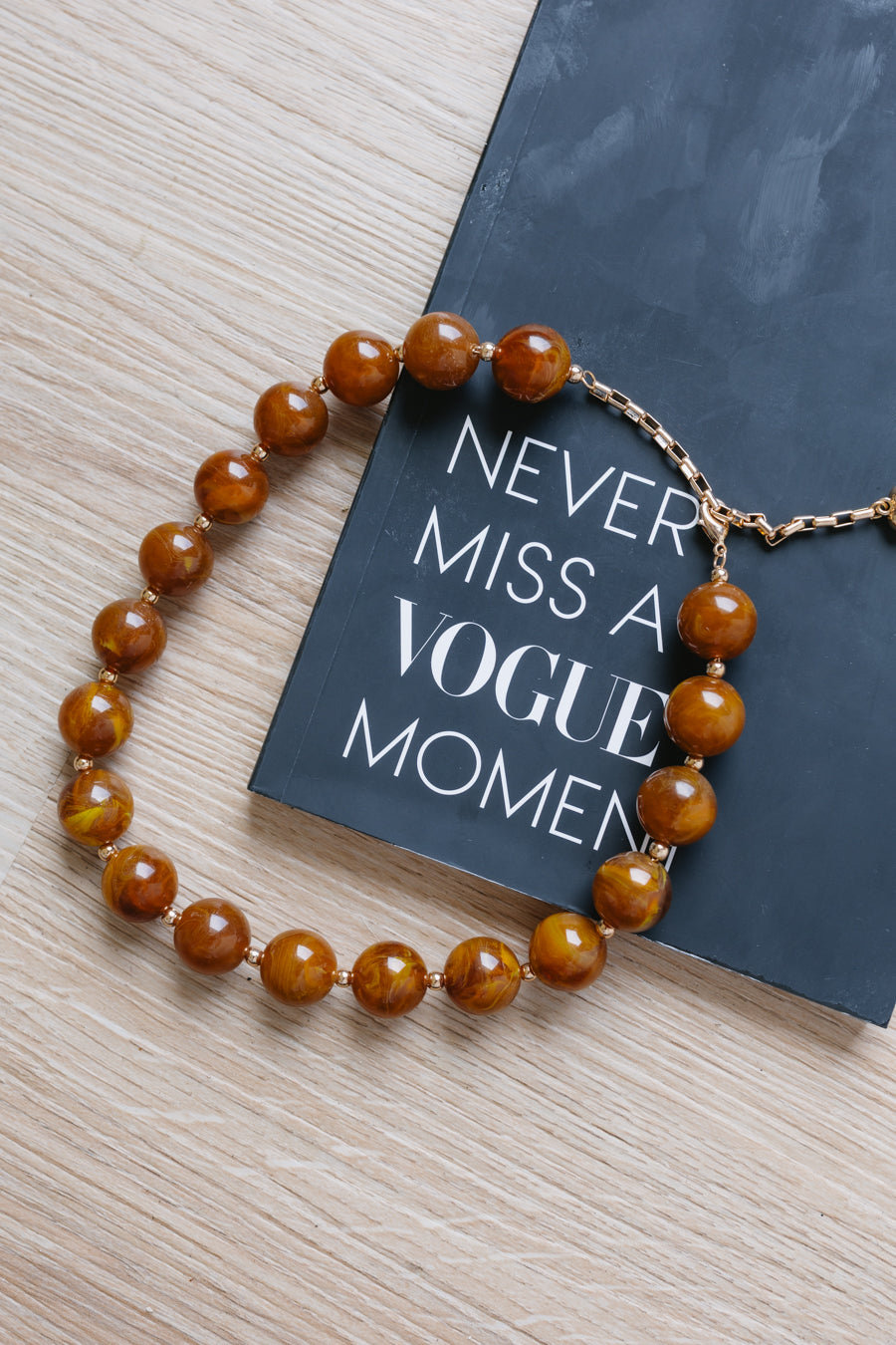 Details Beaded necklaceSmall gold spacer beadsLarge resin beadsLobster clasp with chain extender in back
