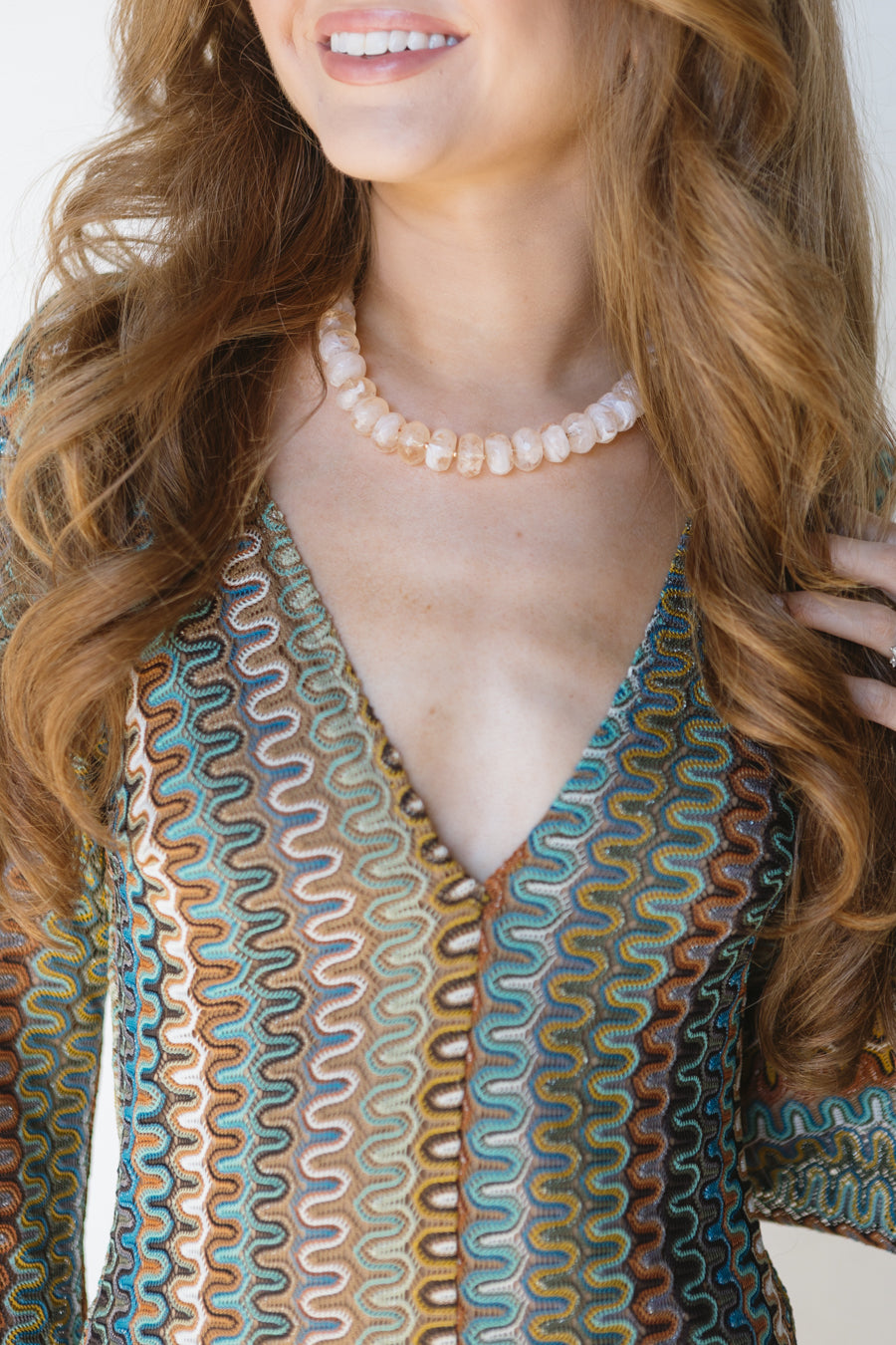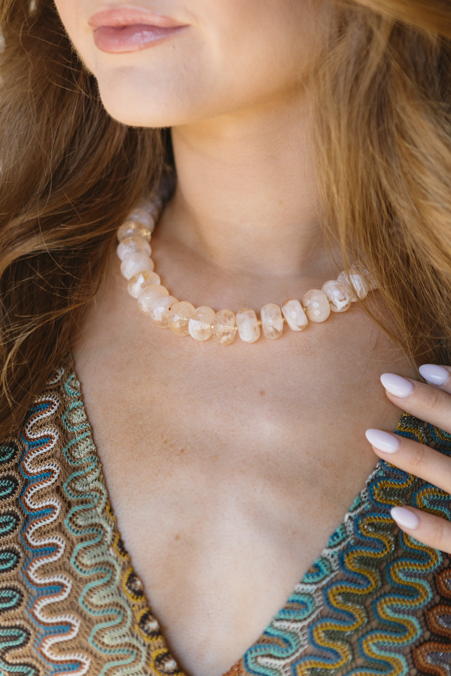Beaded necklaceSmall gold spacer beadsLarge resin beadsLobster clasp with chain extender in back