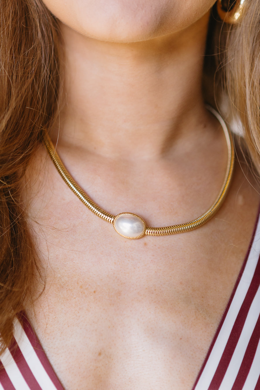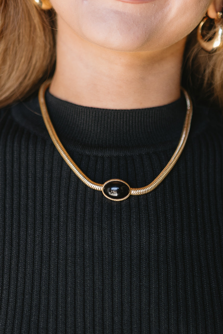Snake chain necklaceCenter pendant of either pearl or black stoneLobster clasp with chain extender in back