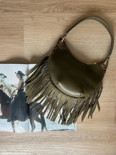 Details Olive handbagFringe detailFaux leatherGold hardwareDetachable shoulder strapMeasures: 6 x 1 x 5