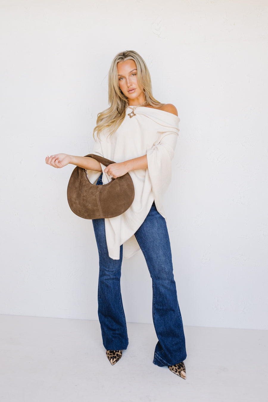 Lightweight knit ponchoFalls to a v handkerchief hemStretchy and soft
