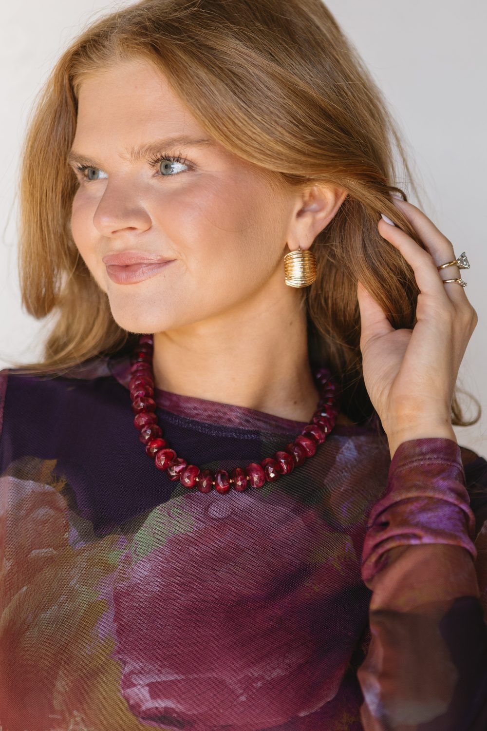 Details Beaded necklaceShades of tan, coral, and gold spacersLobster clasp with chain extender in back