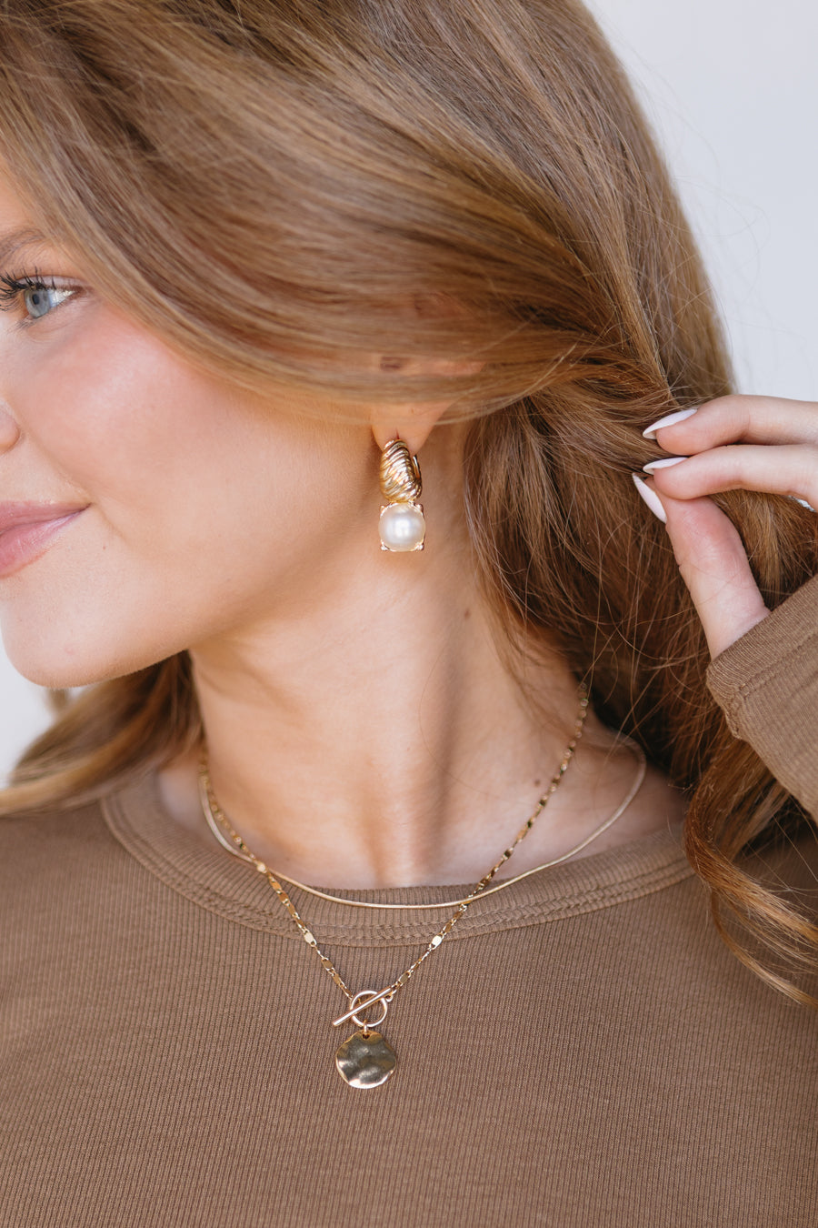 Gold plated earringsSmall huggies with dangling pearlTexturedHinge closureAll earrings are considered final sale.